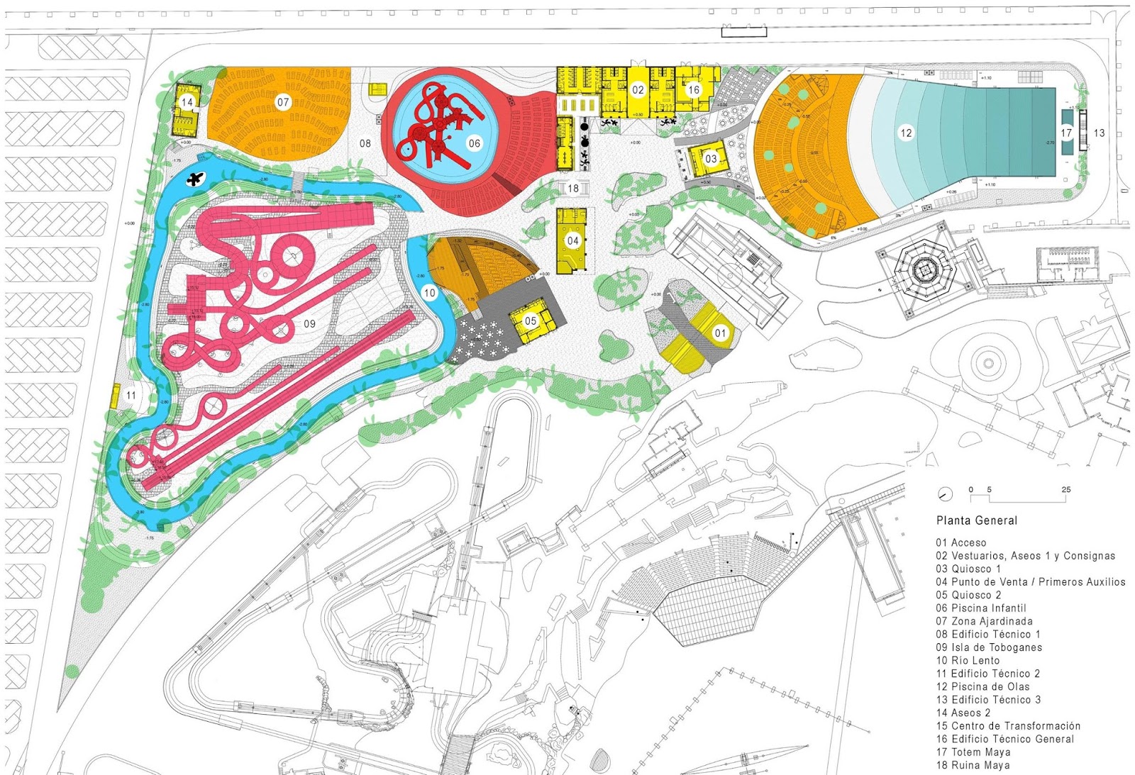 La primera es la plaza de acceso al recinto, otras tres donde se sitúan cada una de las atracciones principales: piscina infantil y piscina de chapoteo, río lento y piscina de olas y una quinta reservada a Zona VIP. Las atracciones están rodeadas por caminos y zonas verdes, que van resolviendo los pequeños desniveles entre las distintas plataformas.