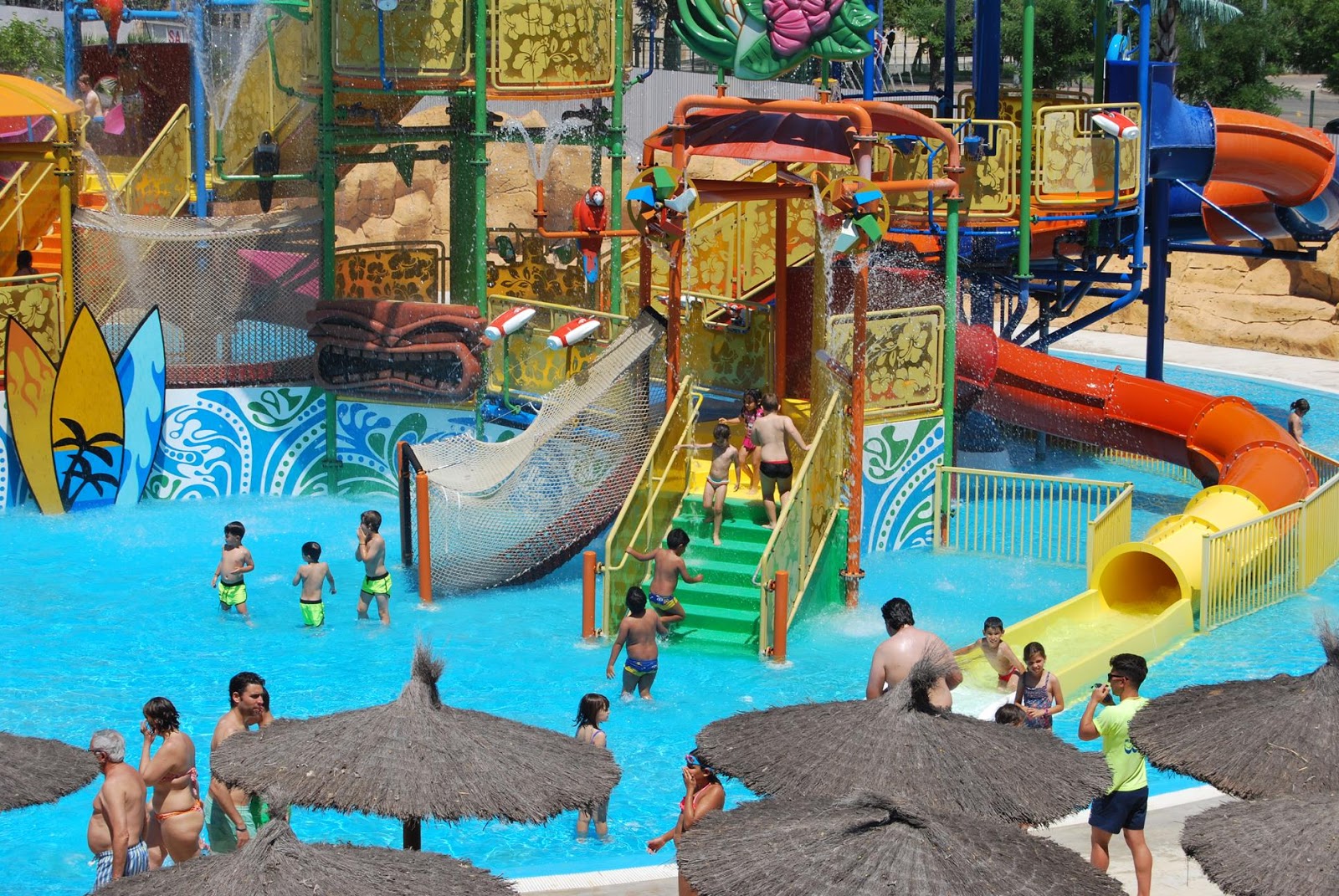 Una portada formada por dos lienzos de muralla acompañada de juegos de agua permite el acceso principal al recinto, donde se sitúa una pequeña plaza como antesala al resto de las atracciones. Atravesando este atrio llegamos a un espacio verde y abierto que actúa como lugar de encuentro y distribuidor del recinto a las distintas atracciones acuáticas.