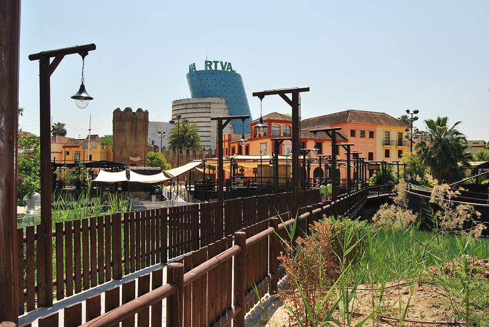Formando parte del Plan de Mejoras de la Accesibilidad del Parque de Atracciones Isla Mágica esta pasarela peatonal conecta dos zonas hasta entonces no tenían relación alguna ‘La Fuente de la Juventud‘ o zona infantil con ‘Sevilla Puerto de Indias‘ la zona de restauración y atracciones refrescantes.